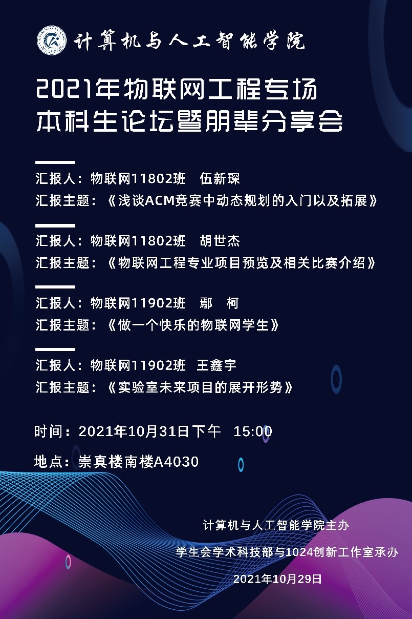 10月31日下午,买足球 2021年物联网工程专场本科生学术论坛暨朋辈分享会在崇真南楼A4030如期举行。本次论坛邀请了物联网专业2018级同学伍新琛、胡世杰和2019级同学鄢柯、王鑫宇分享学术和学科竞赛经验,买足球 党委副书记涂耀威、副院长魏雄及物联网工程系主任聂刚出席了本次论坛。