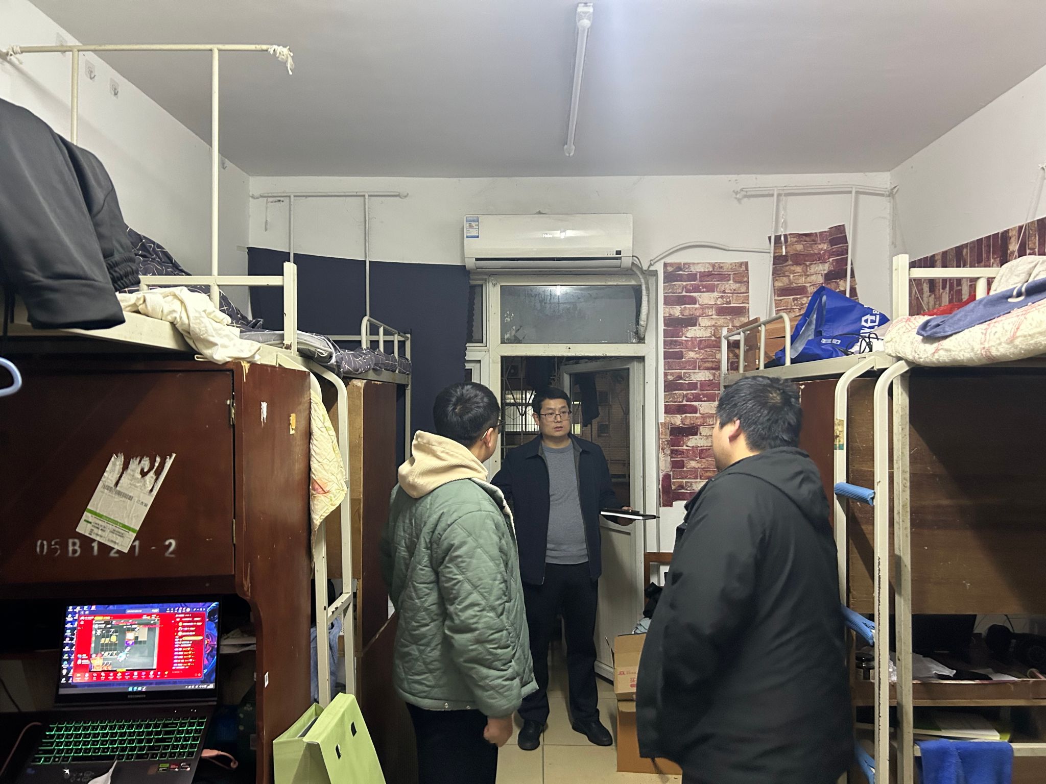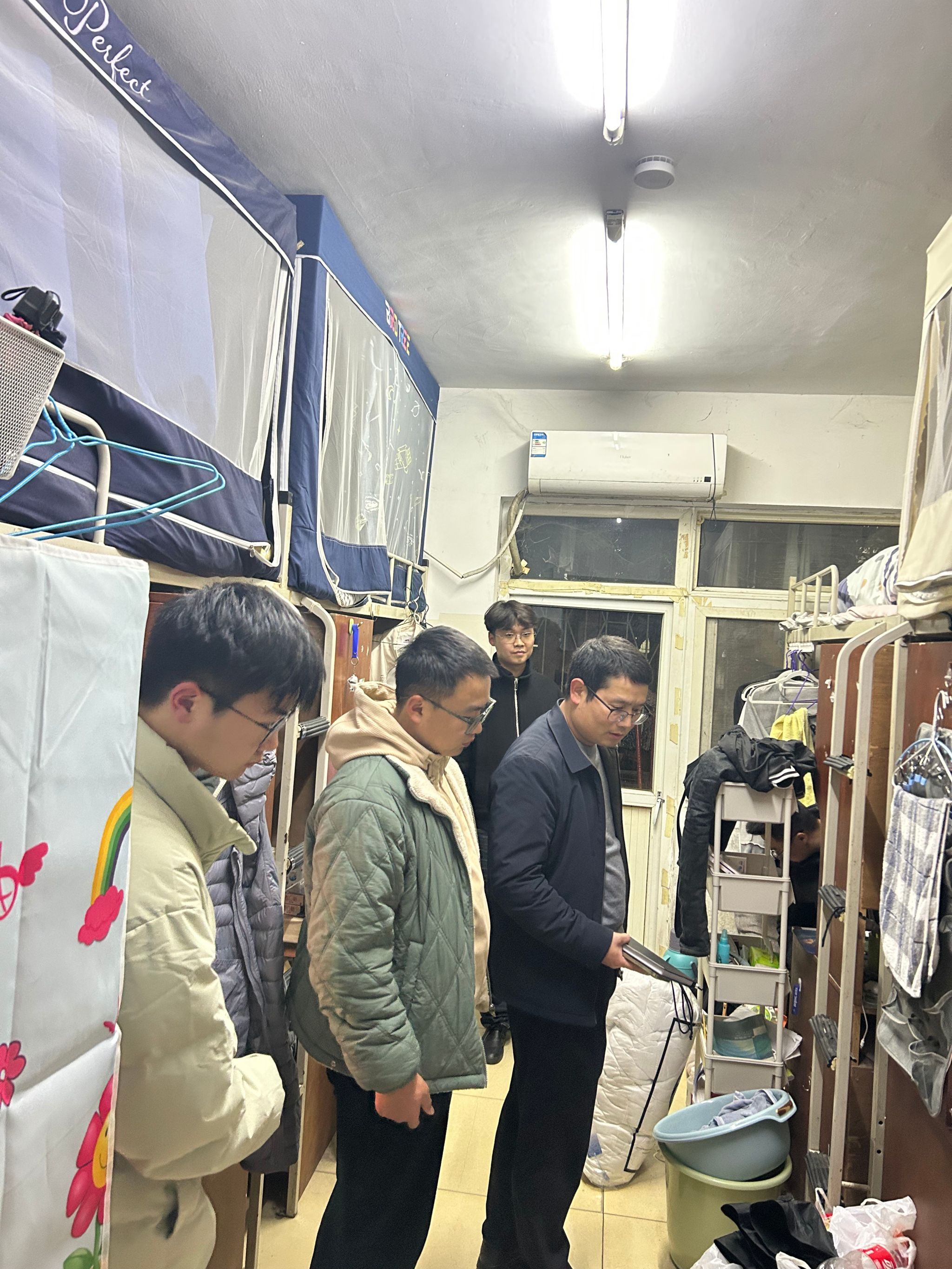 走访过程中,向涛与24级学生亲切交谈,详细询问了大家的学习和生活中遇到的困难与问题,并给予了针对性建议和帮助。针对近期天气突变、温差较大,向涛提醒学生注意保暖。同时还特别强调宿舍用电安全,提醒同学们增强安全防范意识,做到人走断电,共同营造安全和谐的住宿环境。针对上一学期考试挂科较多的学生群体,向涛在走访相关宿舍时,采取“不回避问题、不放弃学生”的沟通策略,耐心告诉同学:“挂科不是终点,而是自我反思的起点。同时建议同学们在平时利用好实验室开放资源,主动参与项目组提升动手能力。”学工团队其他辅导员也对自己检查的宿舍及公共区域存在的问题一一记录,并督促同学们整改,及时反馈给上级部门。