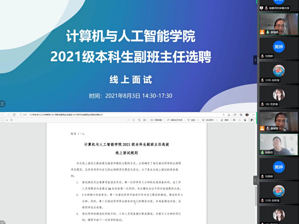 为了2021级本科生能够尽快熟悉校园环境、适应大学生活与学习,加强买足球 2021级本科生管理、教育工作,推进买足球 学生工作全面发展。8月3日下午,买足球 举行了买足球 2021级本科生副班主任选聘线上复试。本次复试由2021级本科生辅导员谢瑞清主持,并与2020级本科生辅导员喻仪、院学生会主席团成员杨静贤共同担任评委,经过前期自主报名和资格审查,共37位同学参与复试。