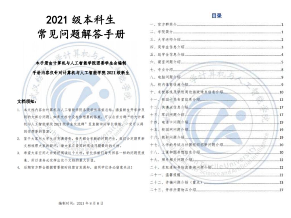 为使新生在有问题时能够及时获得帮助,院学生会主席团成员迅速根据以往答疑手册,综合实际情况,于8月6日完成了《计智买足球 2021级新生常见问题解答》手册的编写工作。该手册从大学生活的各方面为新生作了详细的介绍,旨在为新生的问题提供最为详细、完整的解答。