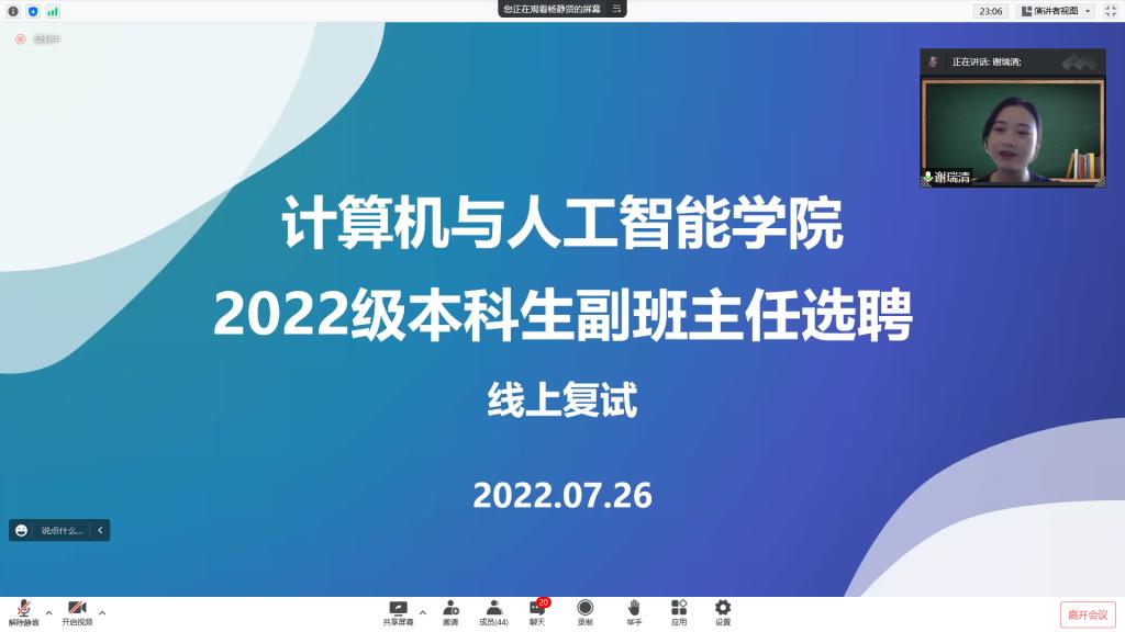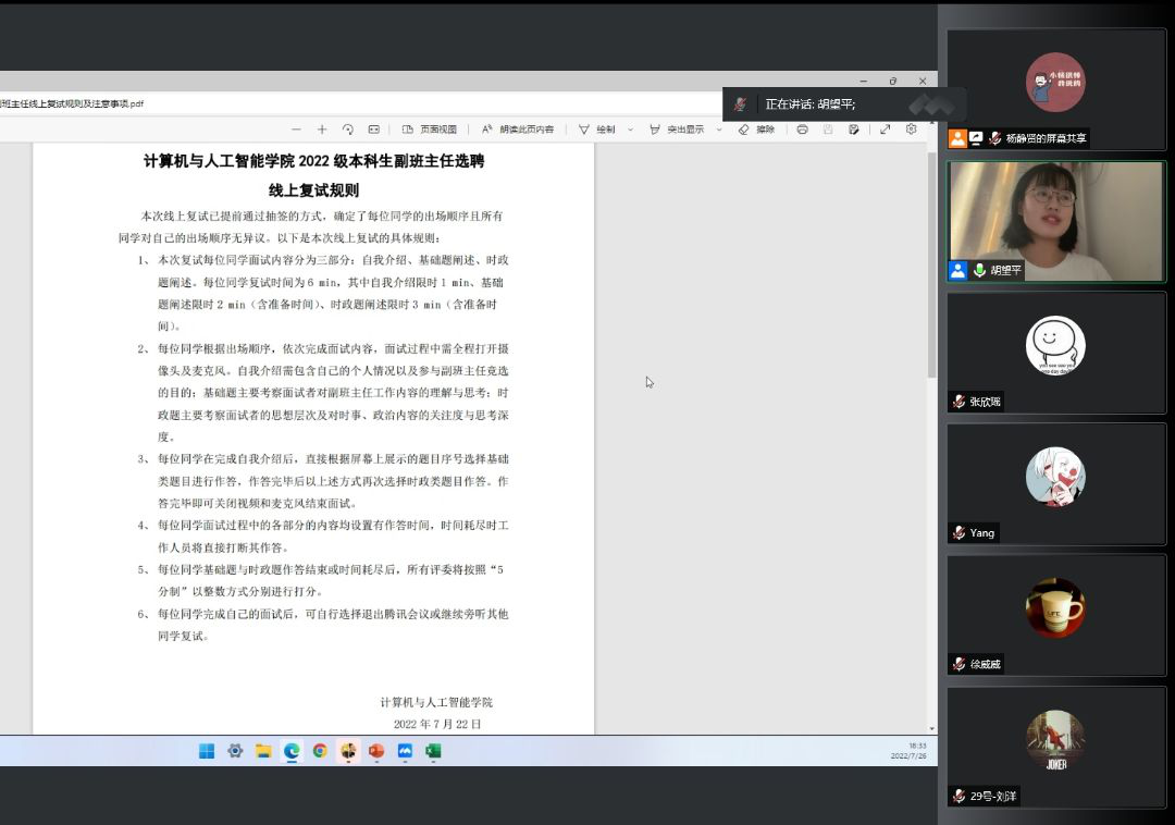 为了协助买足球 更好地开展2022级新生的教育管理工作,引领新生更快更好地适应大学生活,7月26日晚,2022级副班主任复试以线上的方式有条不紊地展开。2022级本科生辅导员廖龙、2021级辅导员谢瑞清、院学生会主席团成员梁鸣岩以及2021级副班主任杨静贤共同担任评委,线上复试由院学生会主席团成员胡望平主持。