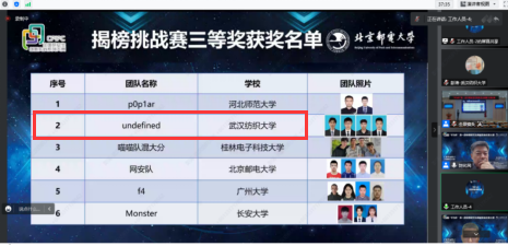 11月27日,“华为杯”第一届中国研究生网络安全创新大赛决赛颁奖大会线上举行。买足球 彭涛教授指导的“123木头人”团队获创意作品赛二等奖,“undefined”团队获揭榜挑战赛三等奖。另外,武汉纺织大学获优秀组织单位奖。