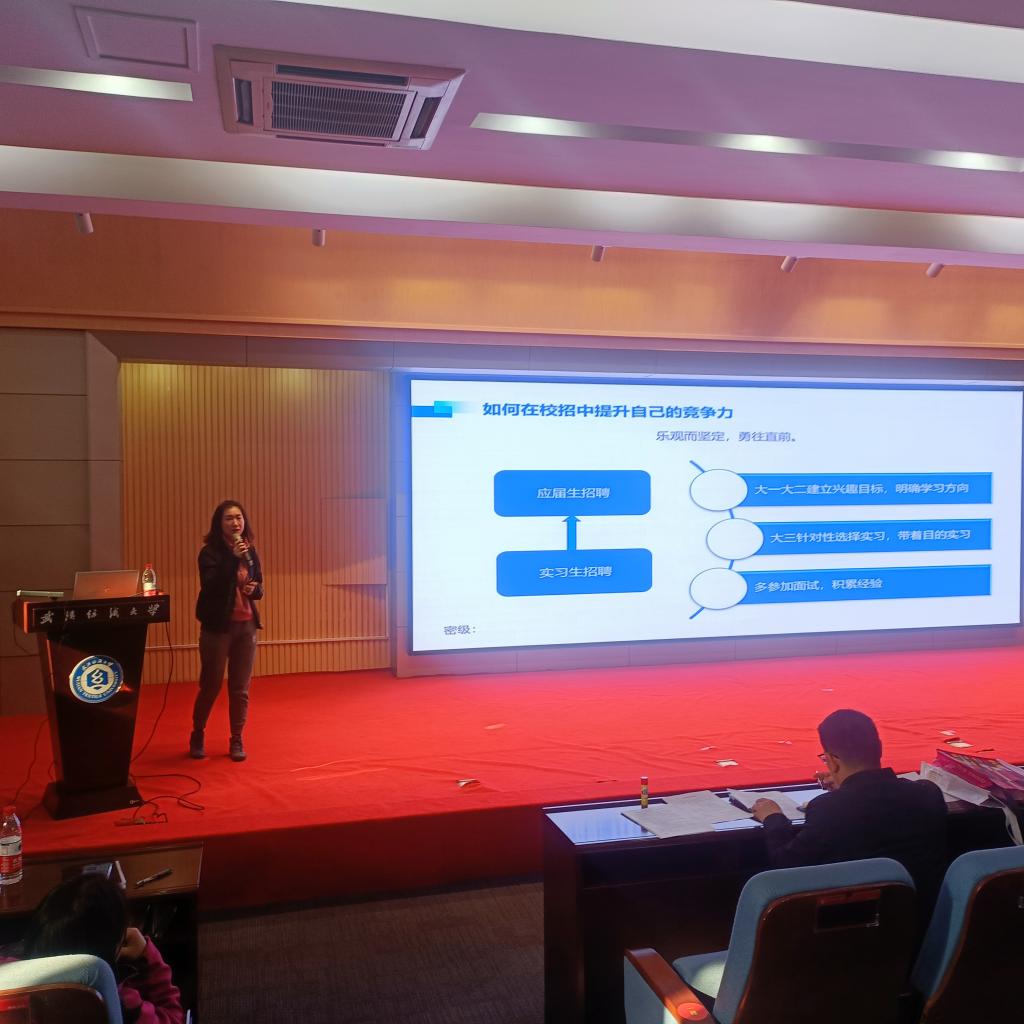 孟媛经理作题为“2023年应届生就业市场分析及规划建议”的报告并进行了招聘宣讲。她从提升竞争力、掌握面试技巧和把握就业机会三方面的内容进行了分享。引导同学们要通过分析内外部环境,认知当下就业形势,清楚自己的优劣势,匹配合适的职位。建议大一大二学生建立好目标兴趣,大三针对性地选择实习,多参加面试积累经验,从而提升自己的竞争实力。从简历制作和面试交流两方面指明了求职中的注意事项,告诫学生要拒绝模板化面试,精心制作简历和准备自我介绍,争取在面试中脱颖而出。最后她鼓励同学们要果断决策、及时沟通,争取早就业再择业。