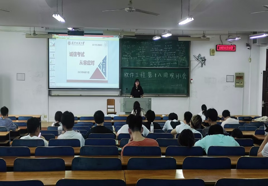 班会现场,辅导员首先进行晚点名,确认学生到场情况,对未到学生逐一进行联系,了解学生状态。班会上,辅导员向同学们强调考试是一种严格的知识水平鉴定方法。为了保证结果的公平,考场要求有很强的纪律约束,并且专门设有主考、监考等监督考试过程,同时提醒同学们禁止任何舞弊行为。
