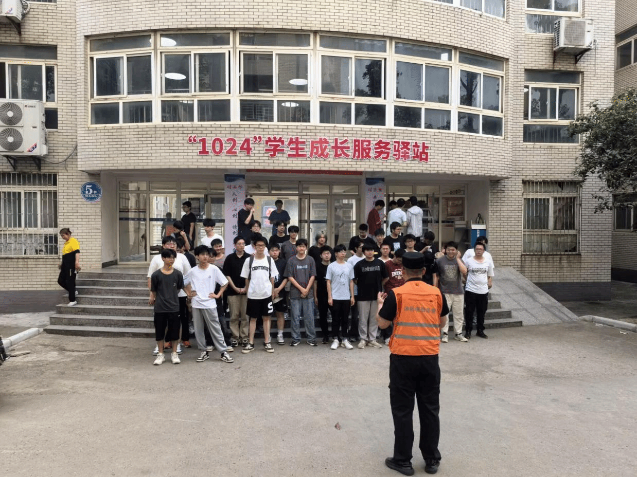 讲座结束后,辅导员陈祯组织男生们前往五栋宿舍楼进行模拟火灾逃生演练。在演练过程中,同学们按照老师的指导,迅速有序地撤离宿舍楼。保卫处消防科队员也在现场进行了逃生讲解,为大家提供了宝贵的建议和指导。